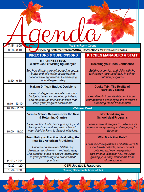 WSNA is excited to host the 2025 Virtual Fall Workshop on Saturday, November 15, 2025, from 8:00 a.m. – 1:30 p.m. This half-day professional development event will once again be held online, making it easy for child nutrition professionals across the state to participate. Registration Closes Thursday, November 13, 2025. This year’s workshop is designed with two learning tracks—one tailored for directors and supervisors, and another for kitchen managers and frontline staff. Our goal was to bring forward topics that directly address the challenges and opportunities school nutrition teams are facing right now. From managing food allergies and scratch cooking to farm-to-school resources, merchandising strategies, and the new Buy American provisions, the sessions will be both practical and inspiring. Click Here to Print the Agenda
